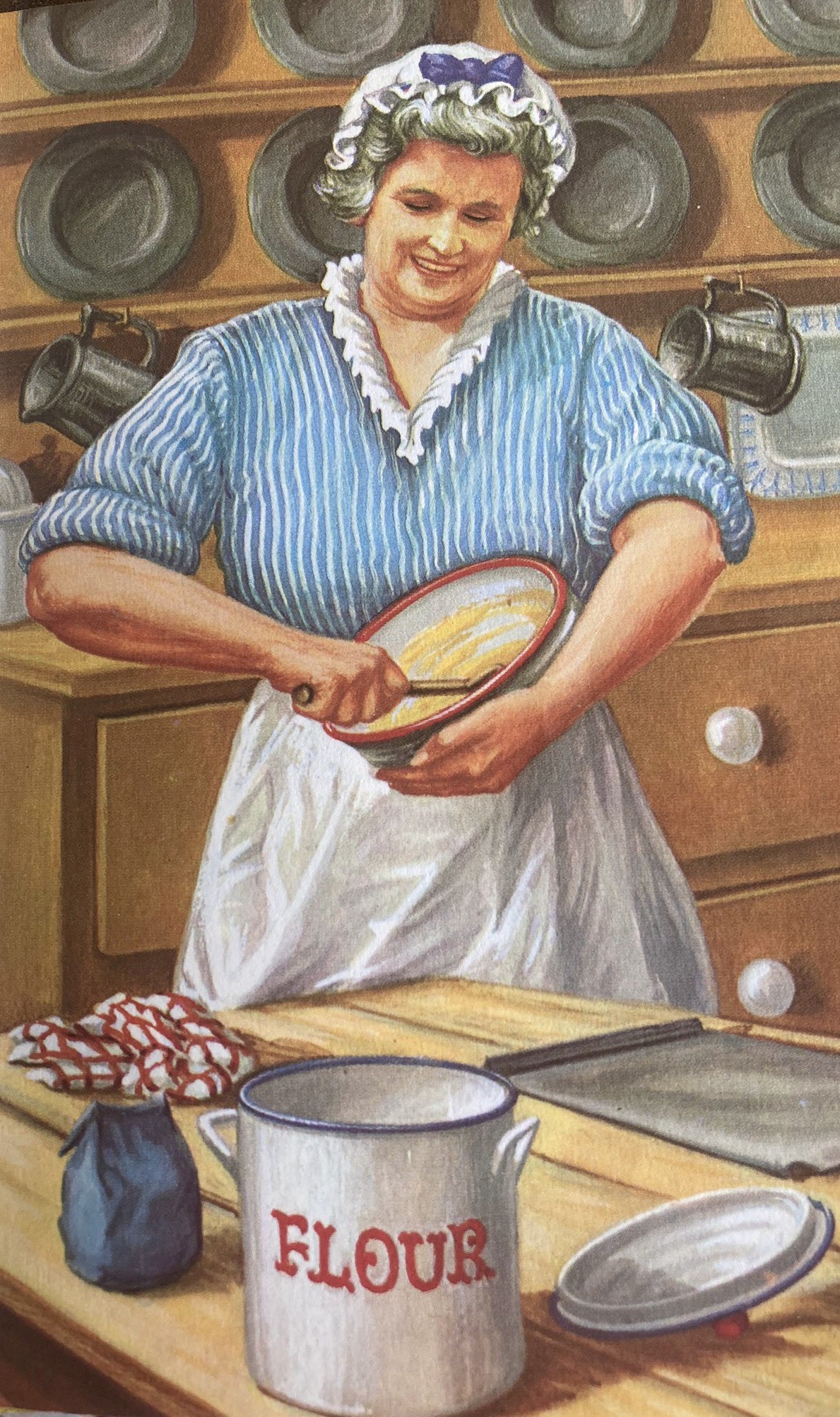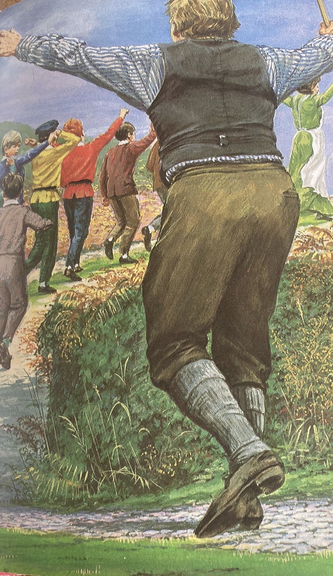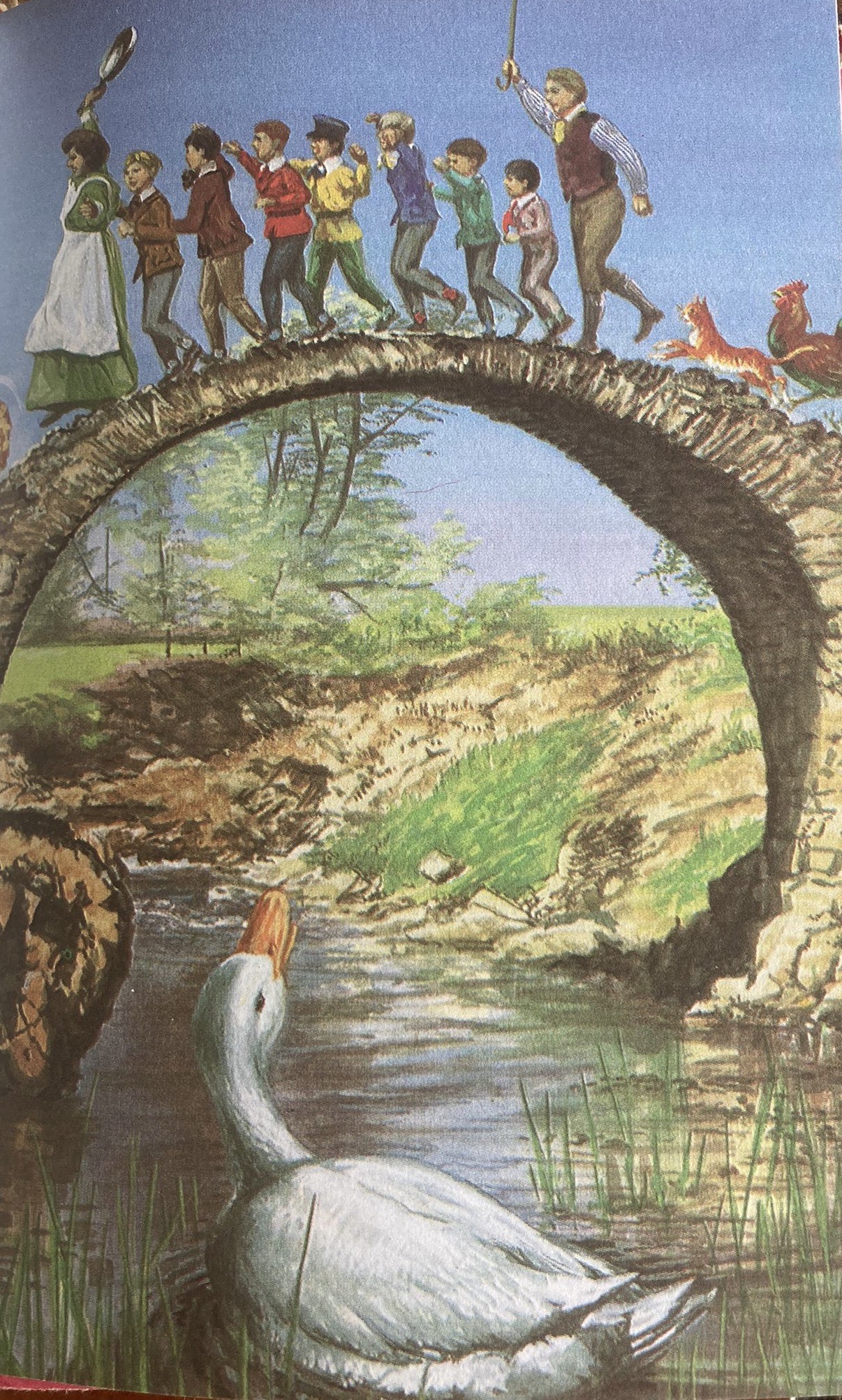I like the dummy Vera Southgate and Robert Lumley sell readers who have already enjoyed The Gingerbread Boy, where the pig balances the pancake on his snout and we wonder for a moment if he is going to swim across a natural body of water with it in a false gesture of kindness and friendship, but I think my favourite illustration of all is the one a few pages earlier, where the conga passes over a hyper-real version of a medieval Dartmoor clapper bridge. Without wishing to be a West Country pedant, though, I do think the river looks less like a one of the many you’ll find on Dartmoor and more like one of those you might find closer to the Dorset border: perhaps the lower reaches of the Otter, somewhere between Tipton St John and Ottery St Mary.