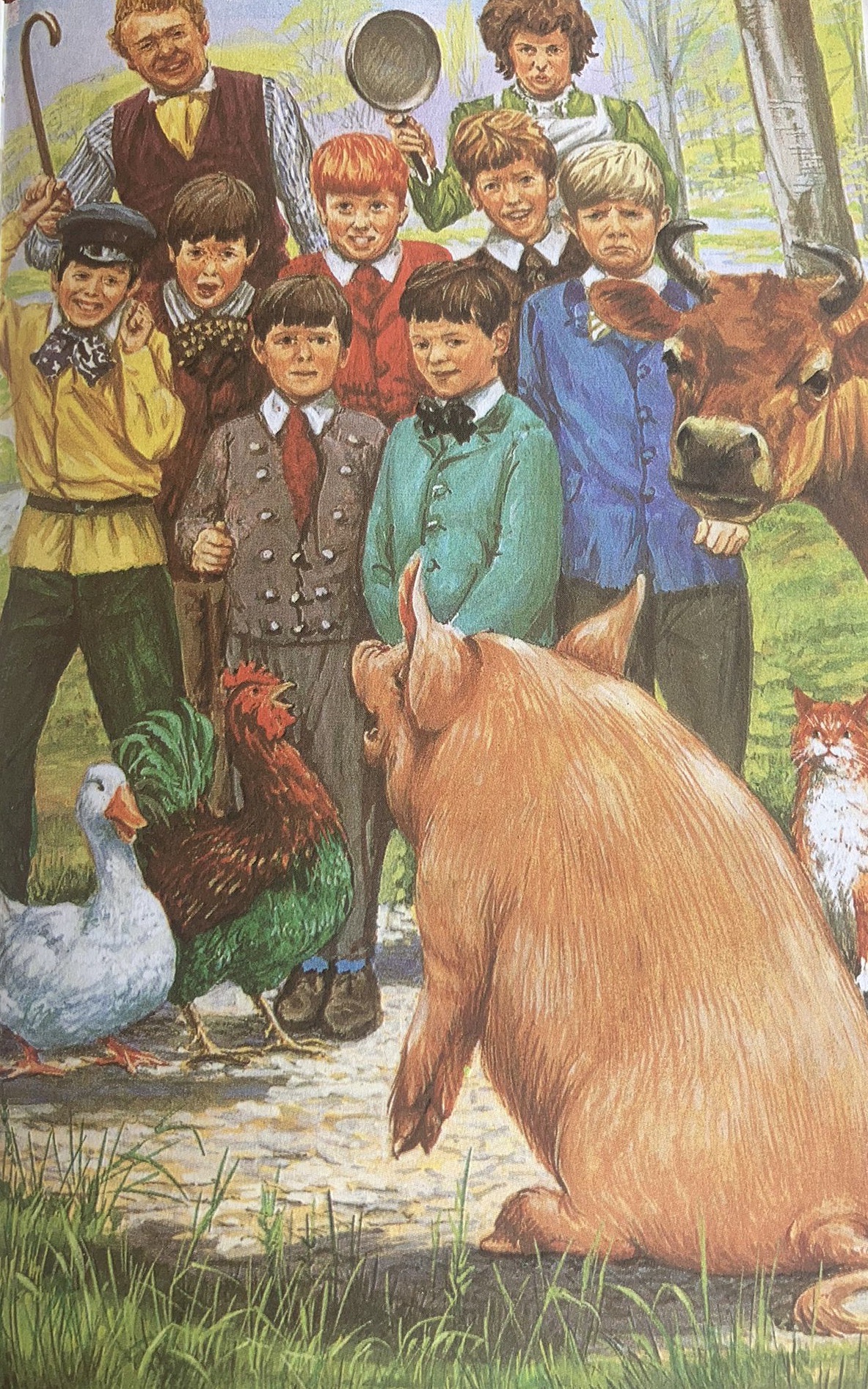 My feeling is that prominence of the cockerel on the cover is an oversell to cockerel enthusiasts since he plays a fairly minor role in the rustic conga: he is certainly nothing like as much of a significant character as the upper class man in plus fours who joins in the fun on page 26, apparently solely because, while on the back nine of a nearby golf course, he has come to the realisation that golf is a pointless game which can never truly lead to a fulfilled life. When the pancake is finally eaten by a pig, the man - along with the cockerel - is one of the few onlookers who seem amused by it. The spoiled slightly Boris Johnsonlike Victorian ghost child on the far right looks especially ruffled by the pig’s gluttony, the ginger cat seems on the verge of tears and, from the look on the mother’s face and the way she is gripping her frying pan, it is clear that even in this darkish era for fairy tales, Ladybird has decided to spare us the more gruesome alternative ending where she beats the shit out of the pig and the upper class man and the cockerel strive hopelessly to pull her off him, shouting “Leave it, Janet! He’s not worth it.” I can’t really tell what the cow is thinking. I get the impression it is mentally elsewhere.