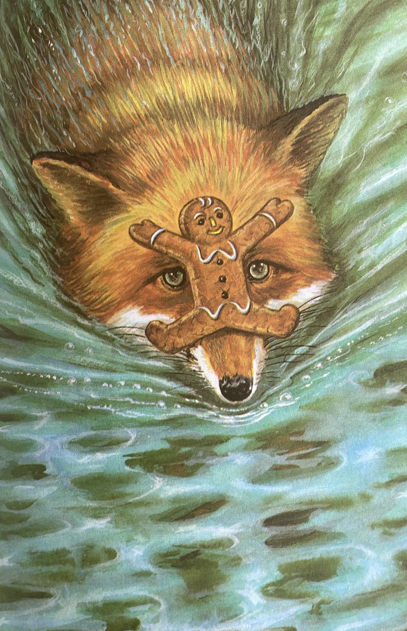 My favourite moment in the book is when, after perplexing humans, cattle and horses with his antics, probably while high on food containing artificial additives, the Gingerbread Boy gets a lift across a river while balancing on a fox’s nose. The image is highly psychedelic and would 100% seduce me into taking a punt on the work of a straight ahead pop band from 1966 who used this image on the cover of an LP they made slightly later after their aesthetic took a darker, more layered turn. While the harmony it shows between Gingerbread Boy and fox is transient, being shattered only a page later when the fox flips the Gingerbread Boy in the air and swallows him, I think it’s most productive not to focus on how tragically the friendship of the two ended, but on just how perfectly balanced and aesthetically appealing it was for that one brief swim they took together.