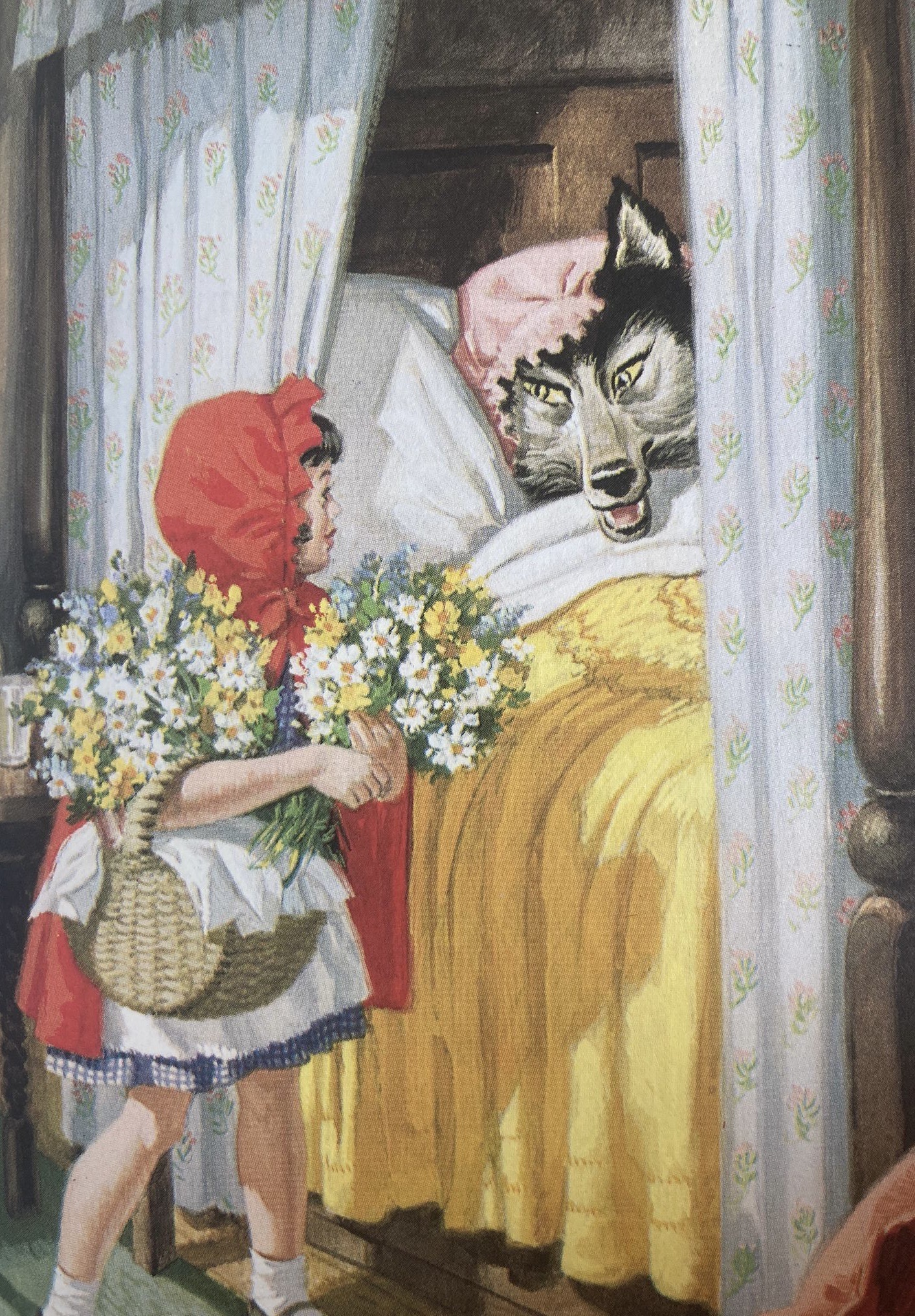 After Red’s dad rescues her and her nan from the wolf’s stomach, the innards clean off remarkably well. Her dad has a look of Rock Hudson in the 1955 Douglas Sirk film All That Heaven Allows. I would like to read the sequel to Little Red Riding Hood where he faces up to the true nature of his sexuality and, after inheriting Red’s nan’s cottage after her death, shacks up with a fellow male woodcutter and the two of them go into business together, with Red - having forgiven him for leaving her mum - initially manning the phones for them then gradually taking over the corporate side of the enterprise, which, while giving her the wealth she desires and enabling her to buy all the smart capes she had ever wanted, never quite makes her happy or removes the taint of slaughter from the cottage’s main bedroom, leading her to sell the property in summer 2020 at the height of pandemic-influenced rural panic mortgaging and make a tidy profit, despite the building’s lack of vehicular access, yet still not exorcise the nagging guilt embedded deep inside her that she had once been at least partially responsible for the death of a wolf who, for all his faults, was essentially just going about his natural business of being a wolf.