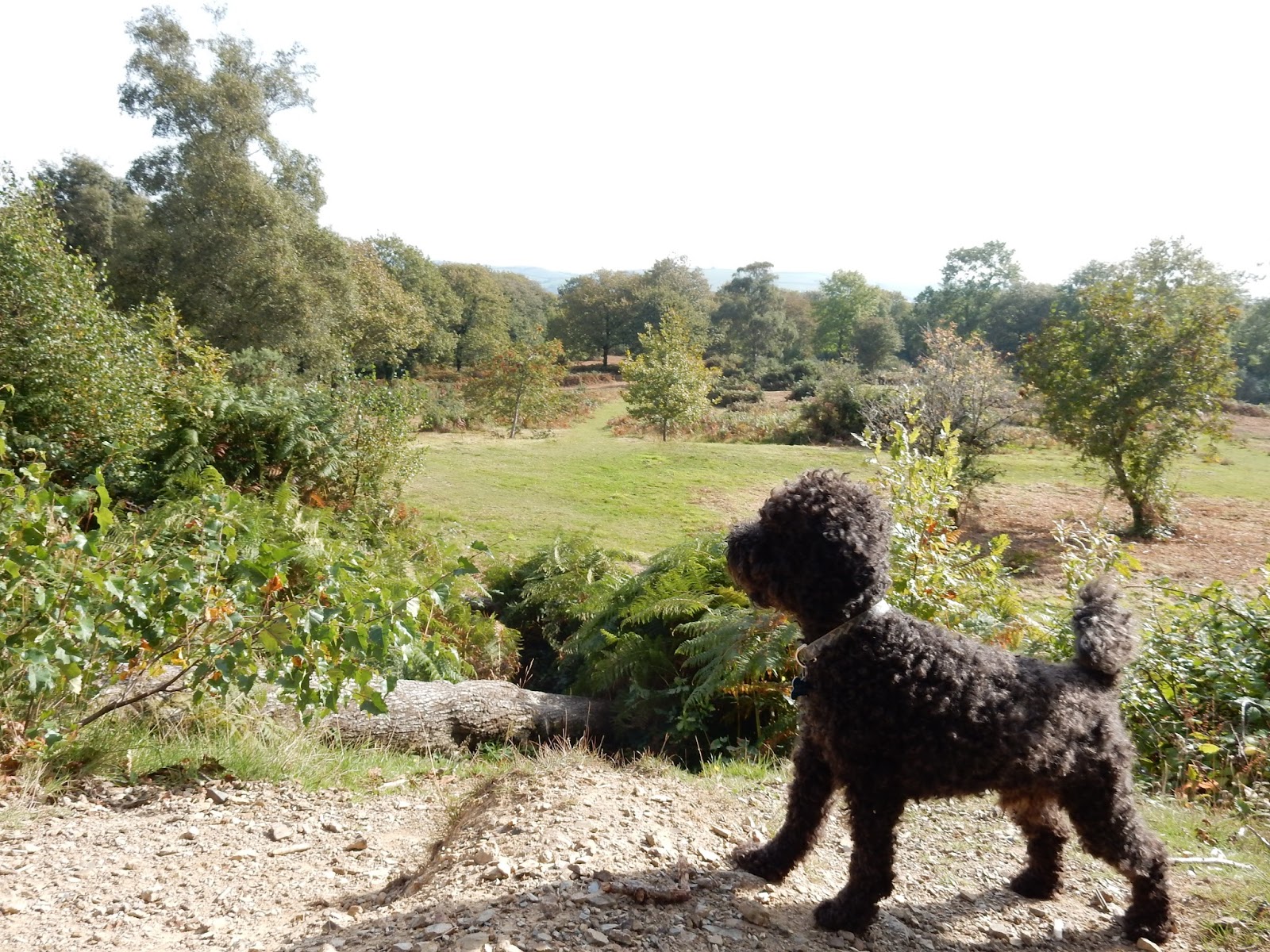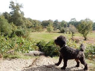 Chainsaws seemingly everywhere in the countryside surrounding my house this morning. Unfortunately they were switched on, too, so I took my notebook to Hembury Woods in an attempt to get some writing done. For this journey I was accompanied by The Blackberry, a dog belonging to my friend Susie, who, before it was pointed out to her that he resembled a blackberry, used to be named Billy. Our journey aptly took us through prime black dog country: above us on the hill the looming ruin of Buckfastleigh Church, containing the tomb of Squire Cabell, inspiration for the dark goings on in The Hound Of The Baskervilles, his grave held down by a large slab of concrete and a strange, squat building, like some hideous cross between a small town toilet block and the lopped off top of a cheap pagoda. This, it is said, was erected so Cabell, who sold his soul to the devil three centuries before heavy metal made it cool, wouldn't escape and go hunting with his pack of demon dogs. Beneath here are caves that stretch for almost three miles containing eery stalagmite-stalactite combinations that resemble human figures.