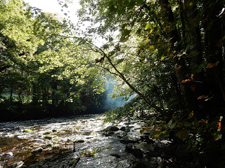 On a bright burnt ochre day like today, you can see almost as far as the coast from this hilltop in one direction and almost to the high moor in the other, but it's the rushing stretch of river a few hundred feet below that's the jewelled blue lining on Hembury's green crown. I've never seen the Dart looking better than it does illuminated here by autumn forest light, with a haze of chainsaw smoke above it. "Has everyone except me got a chainsaw today?" I wonder. I begin to feel a bit naked without one: not completely naked, just as if I've left the house in only my pyjama bottoms.