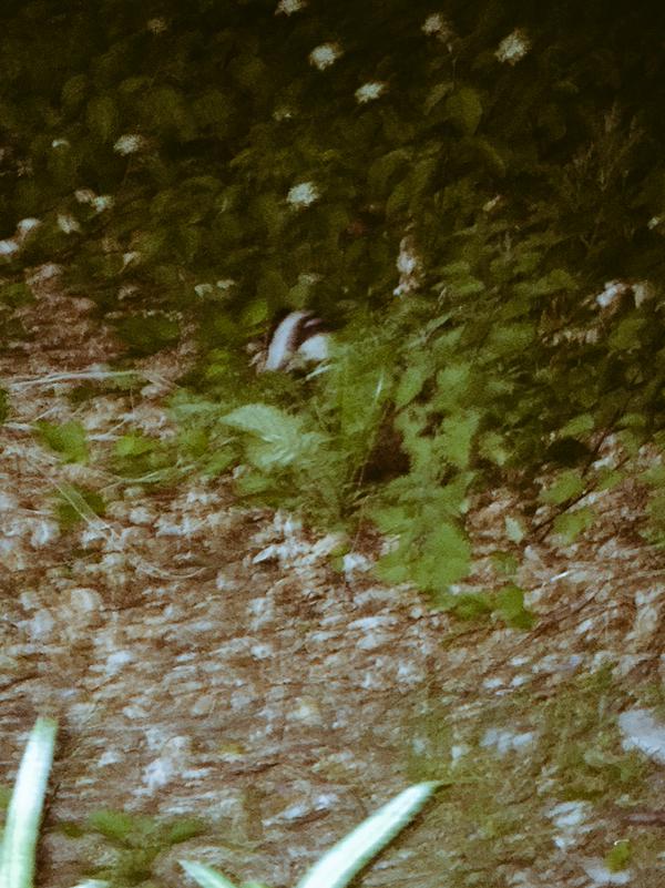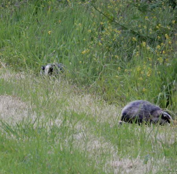 Determined to make amends, armed with a party bowl of peanuts and cat biscuits, I set off at dusk back up to the hilltop where I’d almost trod on the young badger. A further surprise greeted me when I arrived: not just the original young badger from earlier, snuffling about on the mown turf, but a shyer, smaller sibling, in the longer grass and weeds a few feet away. Neither seemed hugely aware of me and I crouched in the grass and watched them for quarter of an hour or so, then scattered the peanuts and cat biscuits, which they duly chomped. It wasn’t until I’d got within about two feet of the bolder badger that it scuttled away. I was reminded of something I’d noticed last year, when I’d got my first close up of a badger: that they don’t run in quite the same way you see the other four-legged furry animals of Britain run. The way badgers run is a bit like a garish 1960s fur footstool might run if it suddenly realised it had the power of functioning limbs.