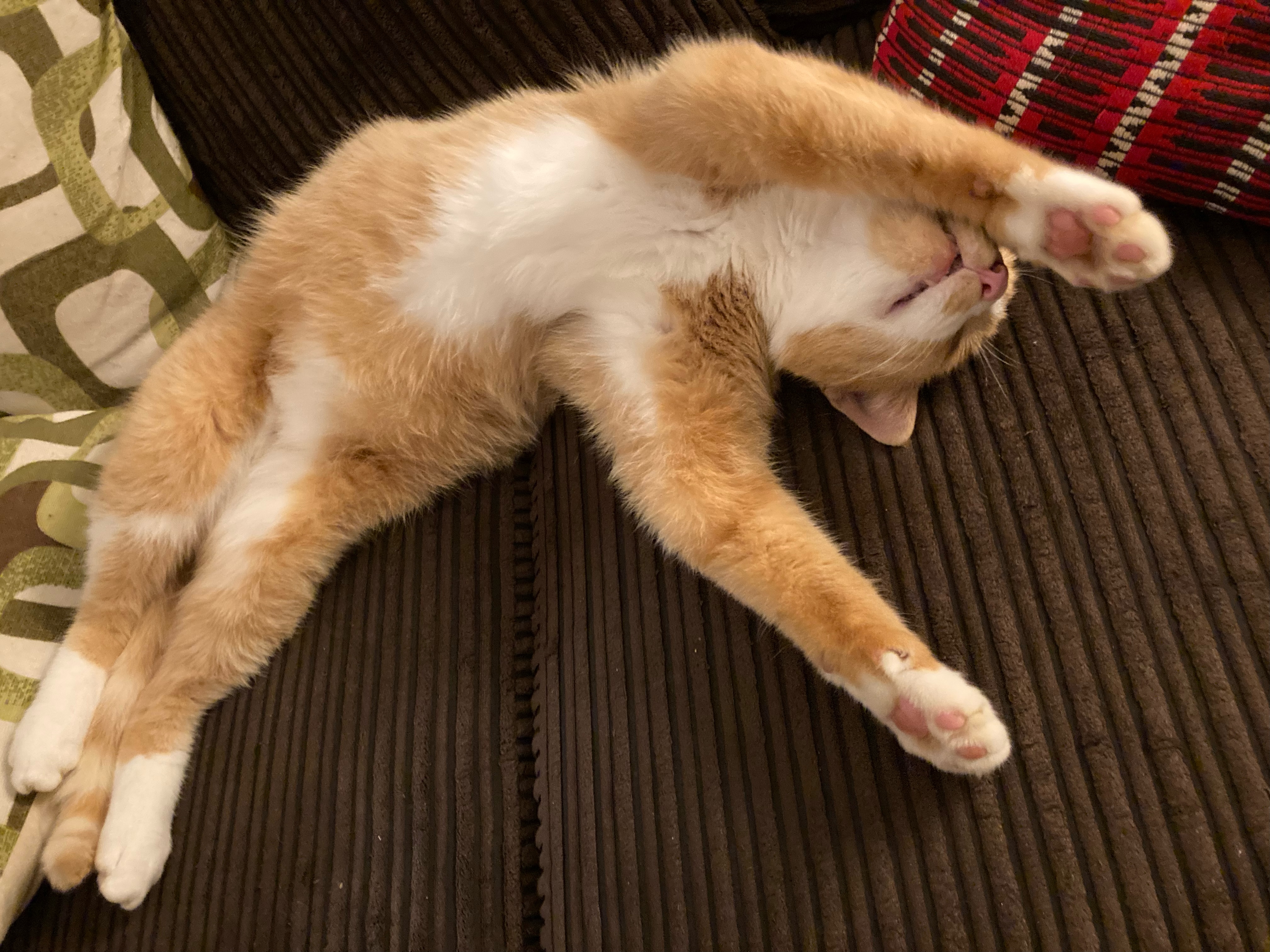 Jim is an enormous, extremely soppy cat who also sometimes goes by his original name Mango and in theory lives semi-wild at a farm a couple of fields away from our house, but our cat Charles brought him over for dinner on December 6th and Jim hasn’t properly left since. Our infamously despotic other cat Roscoe is very accepting of him. Charles, meanwhle, patently falls a little more in love with him every day. During the early mornings, Charles and Jim playfight, with Charles sitting on the 1970s swivel chair in the living room and Jim spinning him in circles from below with epic paw control. Jim, who is around a foot taller than me when he stands up on his hind legs, could effortlessly deck Charles if he wanted to, but his nature is so gentle that he is always well within himself during their tussles. His immense size seems to be one of the countless things he is unaware of, along with the names of the world’s capital cities, the fact that the catflap works in the same way from both sides and the vacuum cleaner’s total lack of personal vendetta against him.