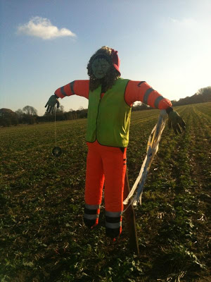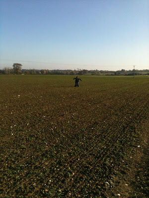 Today I ruined some perfectly good shoes, did the biggest running leap over water that I've done for twenty years and dropped my phone in a ditch all in the name of getting close enough to this scarecrow to photograph it. I think it was worth it: