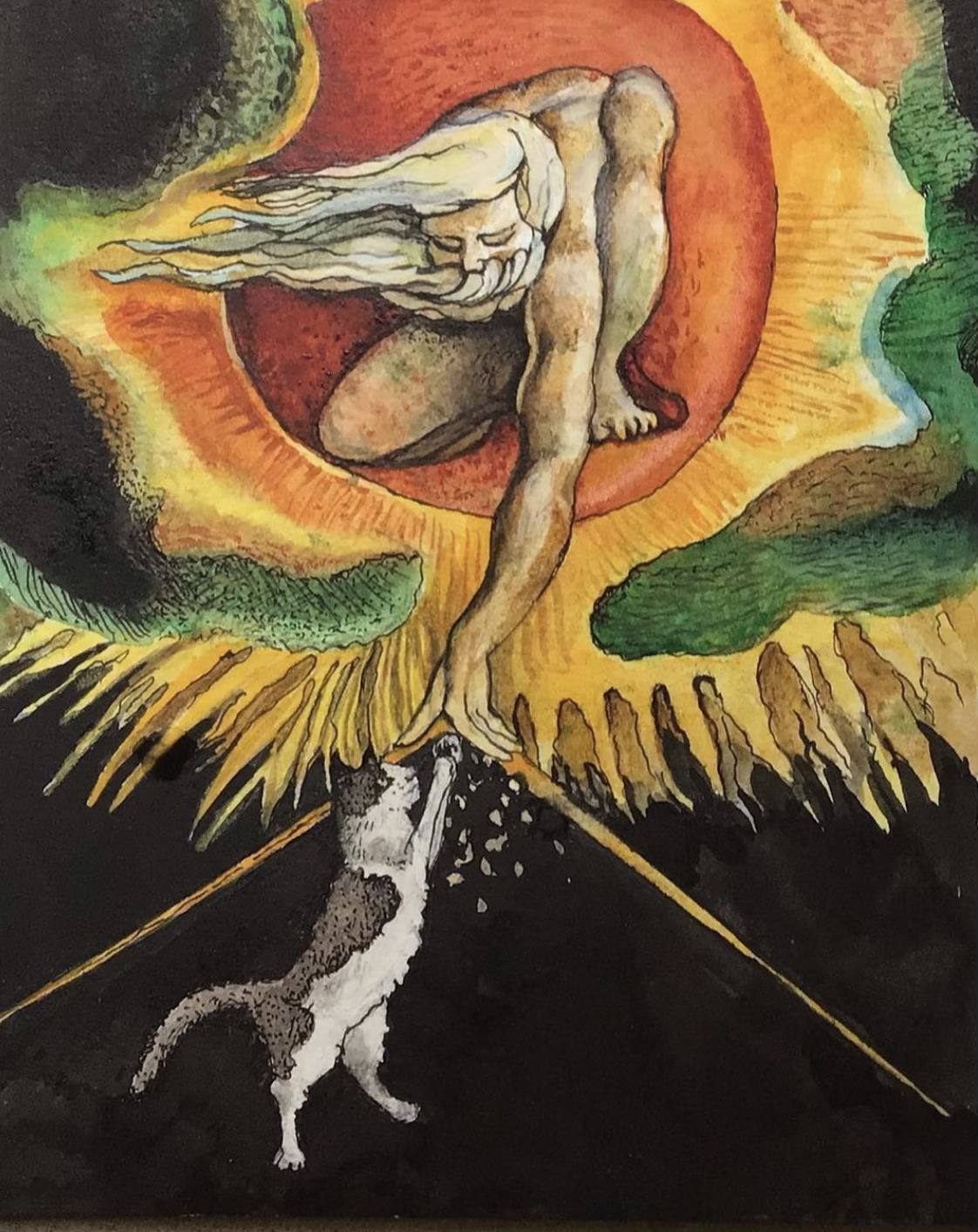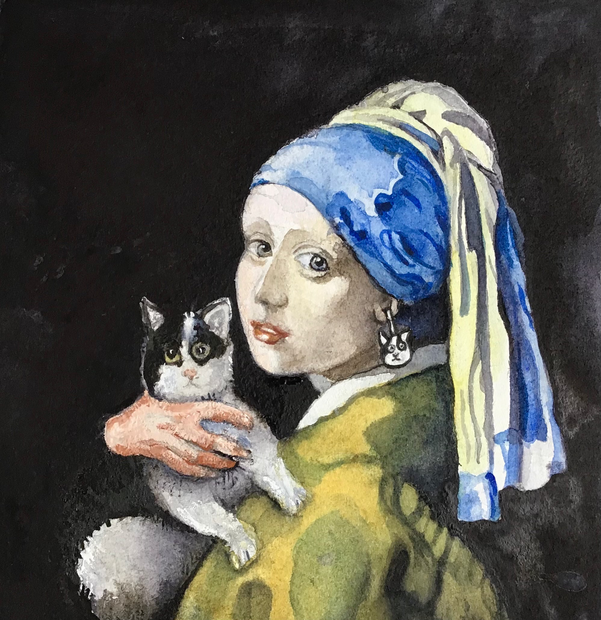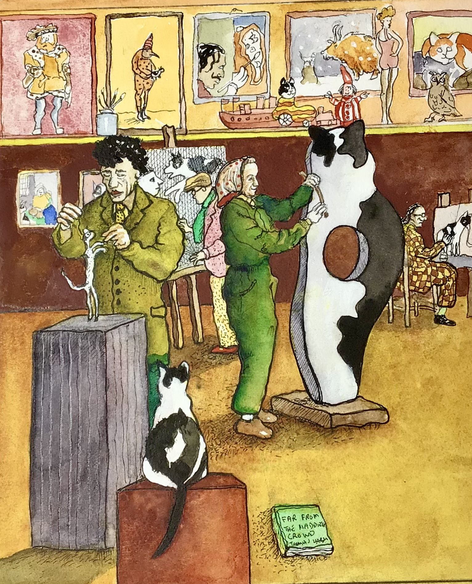 My mum and dad’s cat Bridget (pictured above, more recently) has always been a bit of a wanderer. Never was her nomadic spirit more evident than in summer 2020, when (partly due to her clashes with George) she’d vanish for weeks on end. While she was away my mum and dad suffered many sleepless nights and spent hours walking every lane and footpath within a couple of miles of their house, calling her name. My dad developed a theory: somewhere in the mild Nottinghamshire countryside, Bridget had found an unlikely portal which allowed her to travel through time. To distract himself from his worries, he began to paint what he imagined her adventures to be.