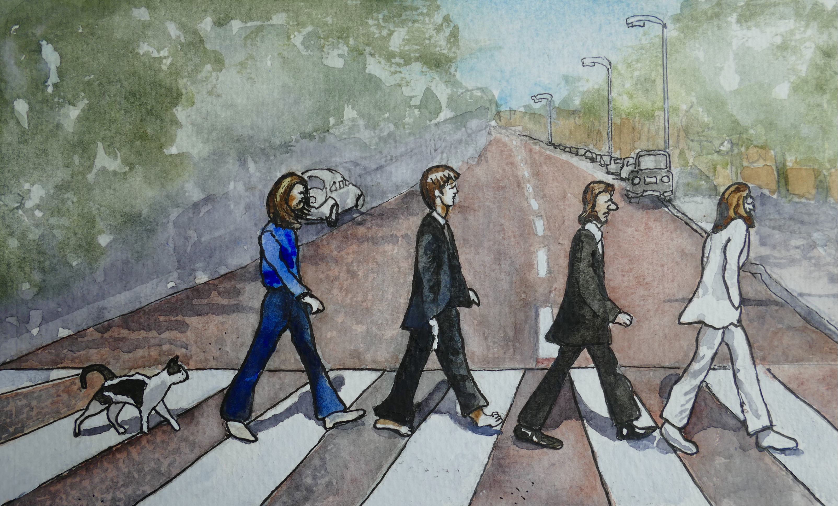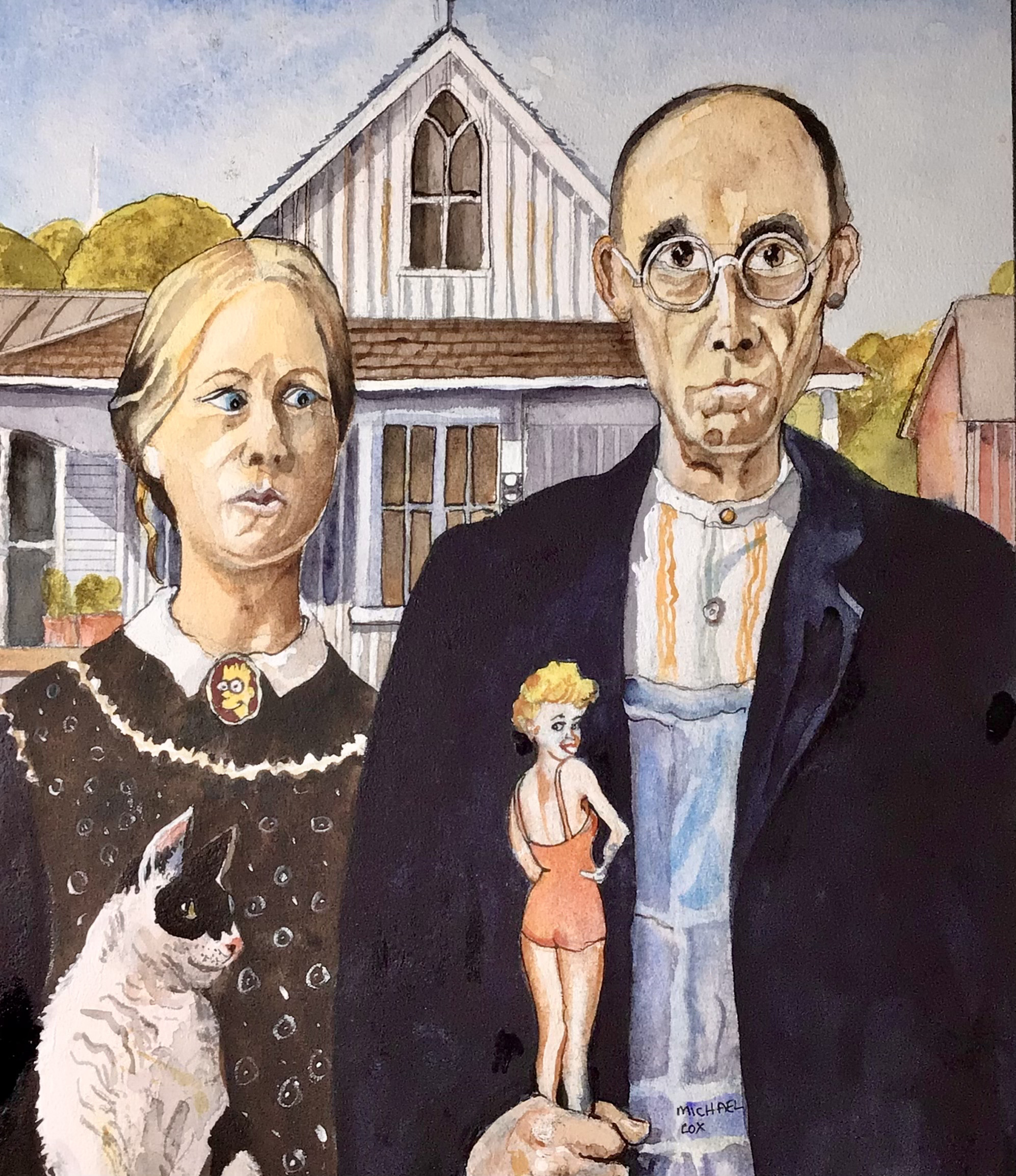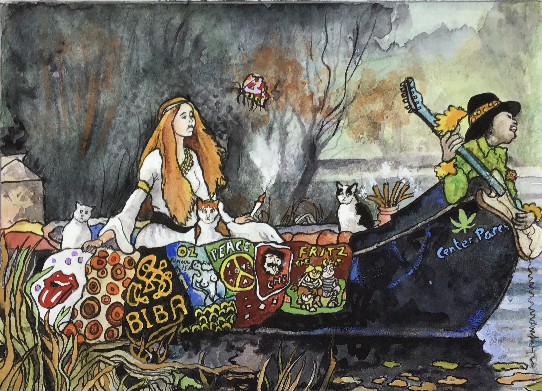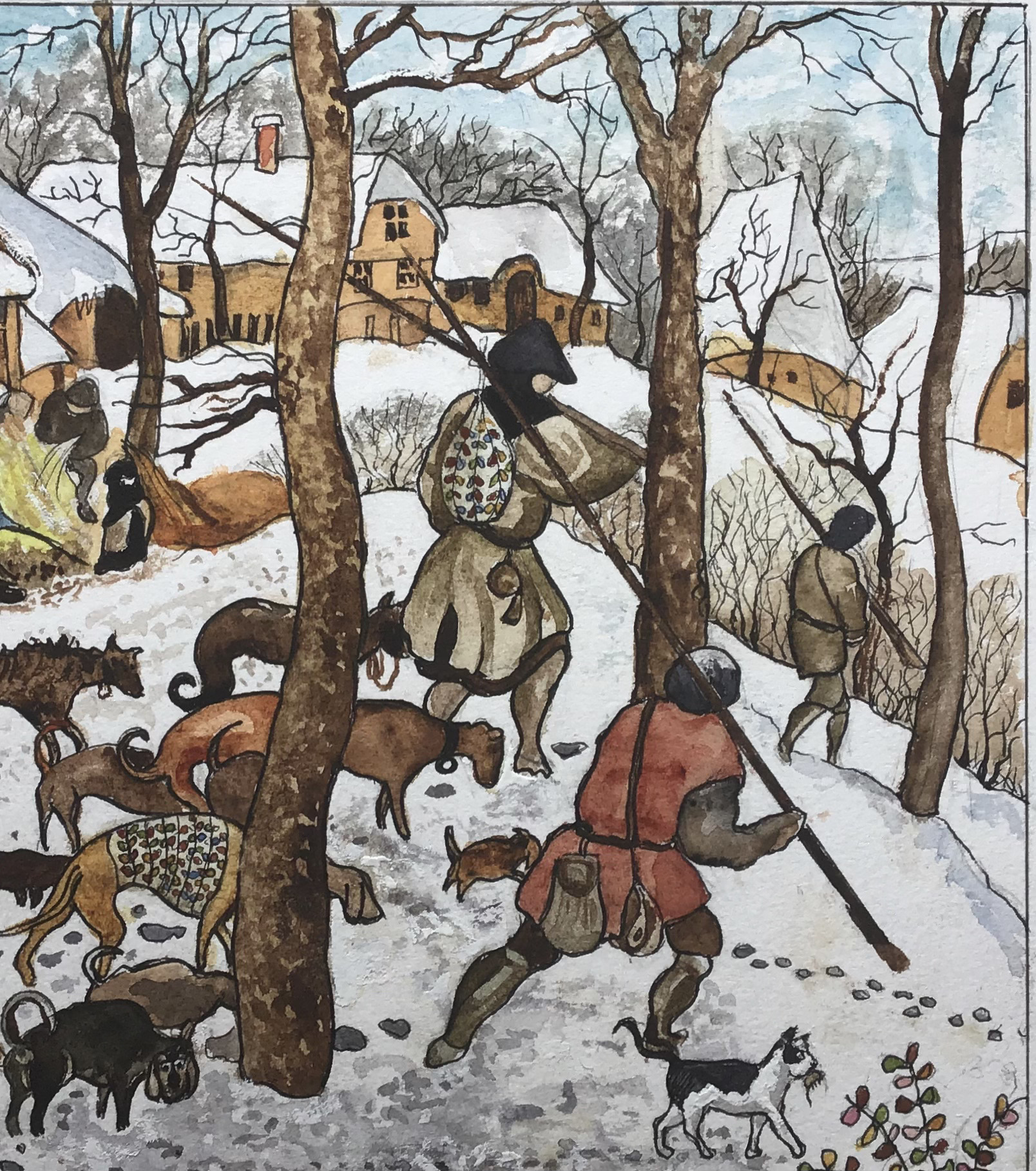 My mum and dad’s cat Bridget (pictured above, more recently) has always been a bit of a wanderer. Never was her nomadic spirit more evident than in summer 2020, when (partly due to her clashes with George) she’d vanish for weeks on end. While she was away my mum and dad suffered many sleepless nights and spent hours walking every lane and footpath within a couple of miles of their house, calling her name. My dad developed a theory: somewhere in the mild Nottinghamshire countryside, Bridget had found an unlikely portal which allowed her to travel through time. To distract himself from his worries, he began to paint what he imagined her adventures to be.