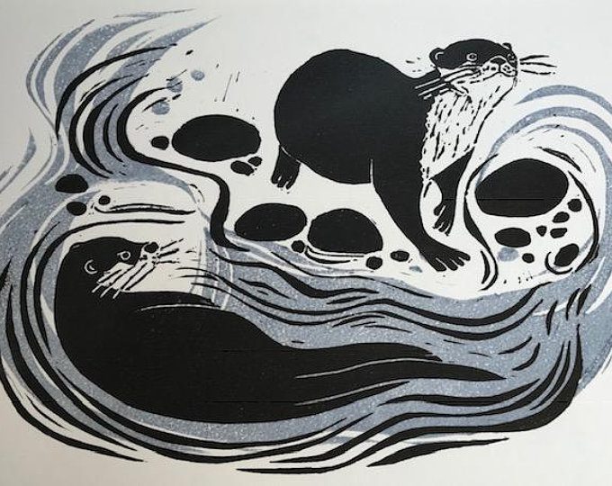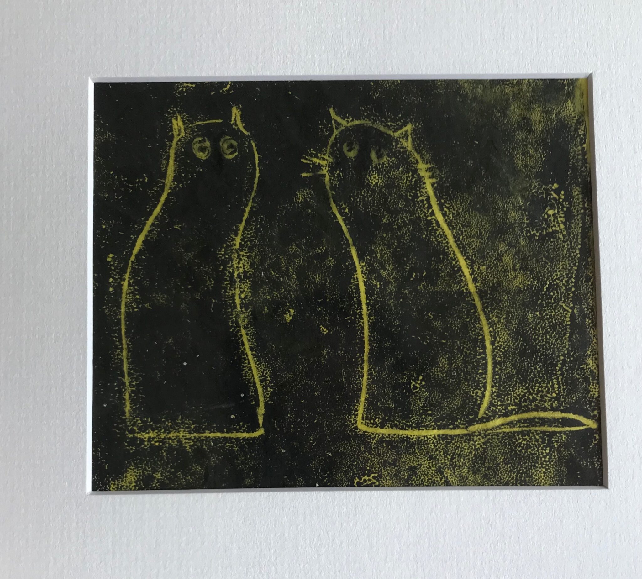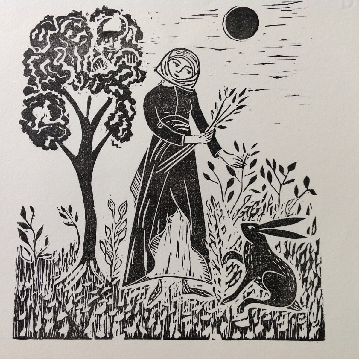 My mum stepped up her work-rate considerably around 2013, not long after her studio was built, in the space behind the narrow utility room, where a couple of Dorothy’s sheds had previously stood. I also played a small part in her new zeal for creativity. That year, which was also the year I went from feeling like I wasn’t going to be permitted to write a books ever again to getting on the Sunday Times top ten bestseller list, with a book that some people presumed was about cats but actually wasn’t but also actually was, my mum started to send me illustrations she’d done of my cats. The first of these was a very quickly executed monoprint of two versions of my cat The Bear, which came out of a conversation we’d had about his owl-like spirit, and - despite being extremely minimalist - perfectly captured a couple of his most familiar expressions: sweetly hopeful, and consumed with obvious worry about the entire universe. Linoprints and embroideries of The Bear - plus my other cats Ralph, Roscoe and Shipley - followed and to look across the span of these is to see a graph of my mum’s style being honed. Soon, the Welsh publisher Graffeg began to sell posters, cards and calendars of her work. In 2017, my mum contributed twenty one nature linoprints to my book 21st-Century Yokel and, this year, another twelve to the follow-up, Help The Witch. She turned down my request for her to illustrate the covers for the books, on the - incorrect, I feel - grounds that “your book needs the maximum chance to do well and if I illustrate the cover it won’t have that.”