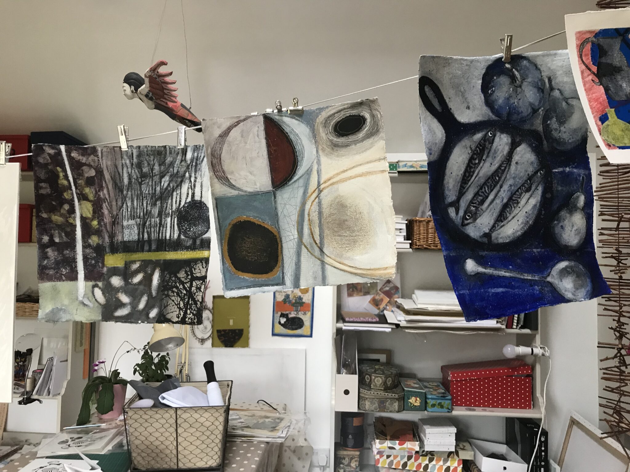 I always liked my dad’s landscape paintings as a child, but it’s only now that I appreciate their fine detail on a higher level: the astonishingly intricate winter trees of his Peak District hillsides, a bucolic yearning for an unspoilt place that’s very him, combined with a slight rawness, an absolute refusal to be at all twee, which is also very him. He’s a little dismissive of these paintings now at times, preferring to concentrate on his blackly comic and more free-flowing new direction: nightmare vistas, grotesque faces, dark mind maps, and twisted reimaginings of popular legend (‘The Tickling To Death Of Jesus’, ‘Winnie The Pooh And Tigger Get Assassinated’), plus - on a lighter note - the new ‘Slow Down For Ducks’ sign that he was commissioned to paint for the village last summer. But my dad is still arguably the traditionalist in the house. A look around my mum’s work room - her new work room, behind the old work-and-utility room, where a couple of Dorothy’s old sheds used to be - this Boxing Day revealed, to name just a few: screenprints of dried flowers, an embroidery of my cat Roscoe, a still life of flowers and a mid-century jug, charcoal drawings of fish in a frying pan, various abstract landscapes, an athletic man made from a coat hanger, a collagraph of a hare in woodland and a linoprint of another more medieval looking hare, with just a touch of automata about it. And I’m just talking about the output I hadn’t seen before.