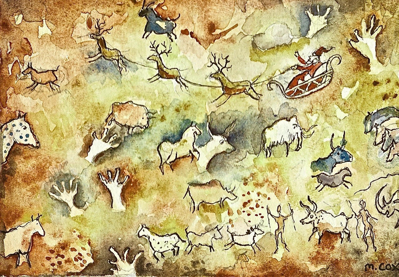 So much about a visit to my parents’ house now feels tinged with my mum’s creativity. As I opened my presents from my parents this year, I noticed each included a beautiful tag, with a new print by my mum on it. Hares, medieval carol singers. “IF LIBERTY SOLD THESE THEY’D CHARGE A FOOKIN’ BOMB,” said my dad. My parents both came up with homemade Christmas cards this year. My mum’s was a print of a robin; my dad’s was a maelstromic cave painting, featuring Santa Claus on his sleigh, pulled by three reindeer, charging through a fire and brimstone landscape of hunter-gatherers and wild animals. I liked them both a lot, in very different ways. My mum’s art room is beautifully light and high-ceilinged and significantly more welcoming than my dad’s office, but it is hard to argue that there is any injustice in this, since for years my mum didn’t have a proper art room at all, and if my dad did have an art room as nice as my mum’s he would soon undoubtedly make it less nice by depositing mud from the garden, maps, bathwater-soaked paperbacks and half drunk cups of coffee all over it.