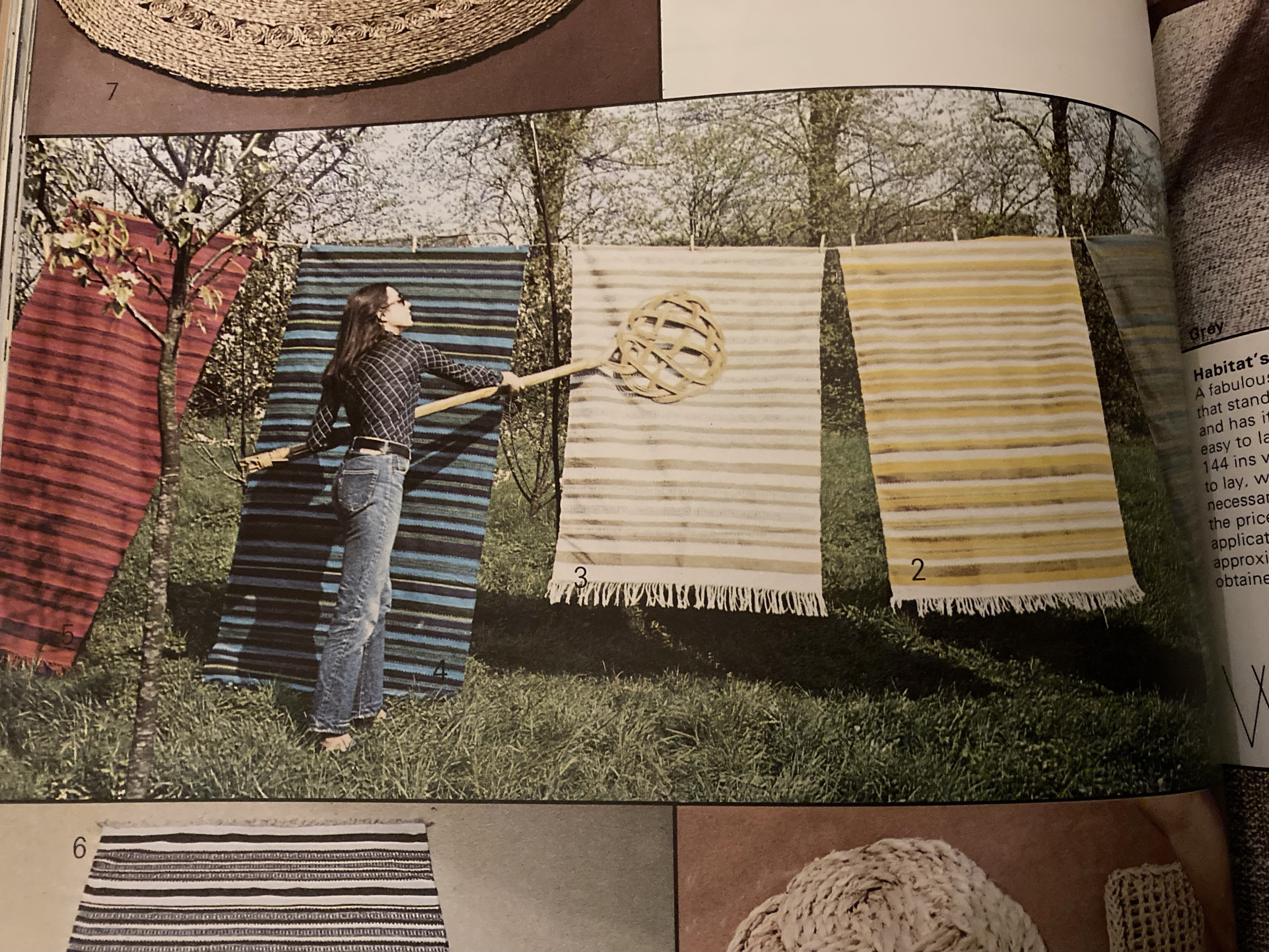 It was the first day of spring and Cheryl put on her best trousers and the blouse she’d appropriated from her sickly sister and proceeded to beat the living shit out of the tough cotton rugs, as she always did when Joel had reneged on a promise and left their bedsit for yet another outing with the ice hockey boys. She alternately gazed at the eclectic rugwork in front of her, handwoven and died by craftspeople, then back towards the bathroom and bedroom-diner-kitchen that she and her vast husband had scrimped and struggled to make their home. “It is possible that we own a number of these that is excessive for our needs,” she thought.