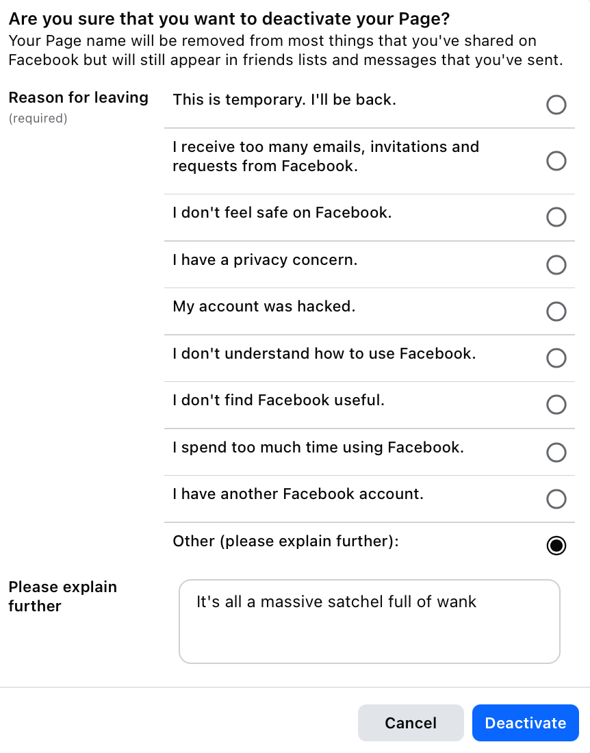 Part of me doesn't want to write about AI at all, ever. It feels a bit like watering a garden full of poison. Also there are already plenty of people commenting about its many vertiginous tiers of evil, most of them far more clued-up than I am. But after posting about the "real" person that AI turned my cat into and then seeing the post go marginally viral on Bluesky I enjoyed witnessing some interesting discussions about what AI is doing to people's brains, in addition to its already devastating environmental impact. Meanwhile, via Facebook, I learned, from some people who feel positive about AI, that AI enthusiasts and AI itself have one major character trait in common, which is being entirely devoid of a sense of humour. But then that's the problem with the Bluesky social network: it's full of all these lefty woke snowflakes who don't want the planet to die and actually cherish their own ability to think complex thoughts. Much better to get both sides of the story by opening yourself up to people who don't read books and have offered themselves consummately to a terrifying technobillionaire-driven mind cult that, as it drains our resources, is hell bent on blotting out the last vestiges of their capacity to form any original nuanced thought grounded vaguely in reality. Or I could just delete Facebook? I probably should. Oh, I actually did? Thank fuck for that.