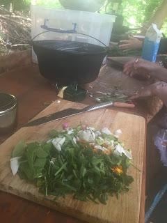After only a few hours in a tucked away corner of the Devon countryside like this with a group of strangers, a strong sense of community sets in: a possibility in the air of being part of a new underground society. Or maybe that was just me thinking about the rebels in Sleeper again. Whatever the case, new ways of communication emerge and become normalised very quickly. Here, the statement "Look - Rainbow is making a spit poultice!" seems no less surprising than the statement "Look - Darren is sniffing some Copydex!" would have seemed in the woods behind my old house on the Nottinghamshire-Derbyshire border in 1988. I felt my inexperience keenly alongside most of the foragers and didn't personally make any spit poultices but was pleased when Anna said "You look like a man who's good at lighting fires!" and allowed me to start the blaze on which we later cooked some of our findings. There was just enough bannock, forager's stir fry and wild salad to go around but I have to admit that afterwards I drove straight to the petrol station a few miles away and bought a massive fuck off grab bag of samosas and pakoras from their hot shelf.