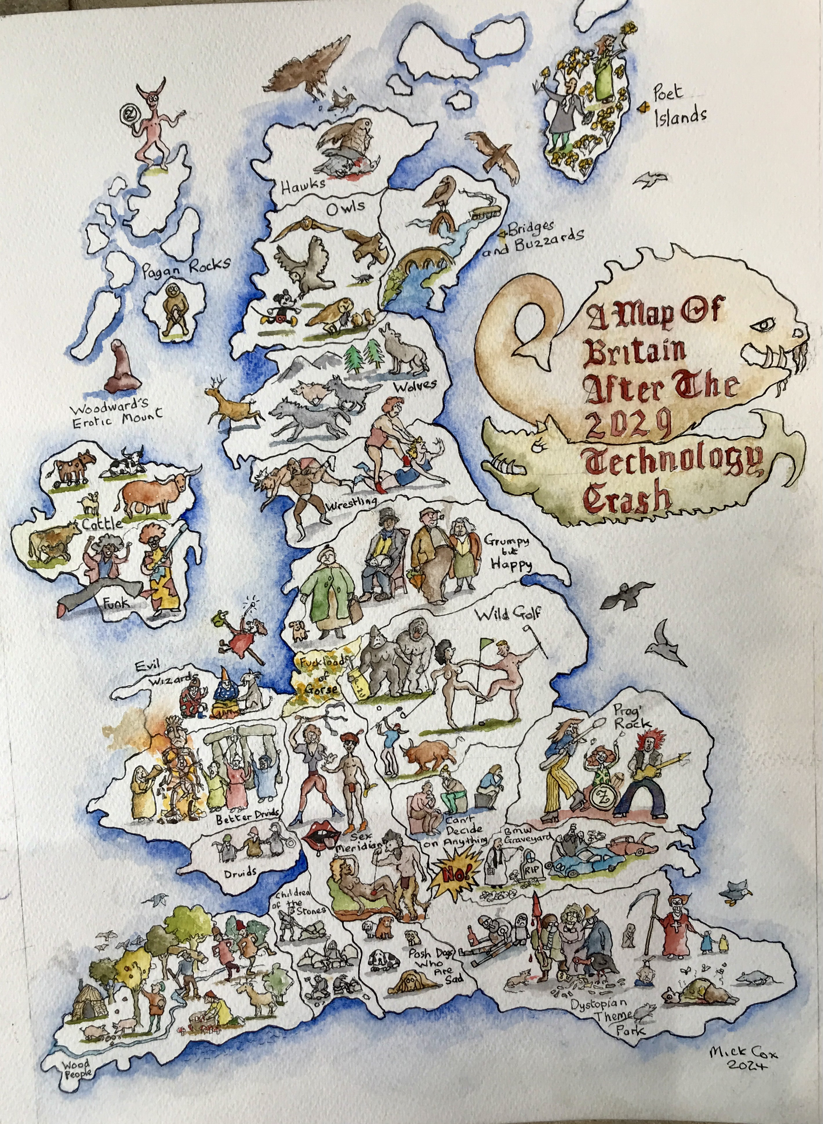 It was 2015 when I first sketched out my ‘Map Of Britain After The 2029 Technology Crash’. Recently, I gave the sketch to my dad, Mick, and he came up with the infinitely more attractive and detailed version you can see above. 2029 seemed exotically, brain-meltingly far away in 2015 but now it’s no further in the future than the beginning of Covid is in the past. Or, to frame it in a way that seems starker and more brutal to me on a personal level: I have a shirt I bought around five years ago that I still think of as “brand new” and am yet to properly unveil in public. With that in mind, I probably should get onto a few pre-Crash jobs I’ve been putting off: make sure I have the landline numbers of all the friends I want to keep in touch with, finally print hard copies of some of my favourite digital photos and put together an album of them, collate all the home addresses of my Substack subscribers who wish to continue to receive these newsletters in A5 pamphlet form as the analogue 30s take hold. As always, it’s probably later than I think.